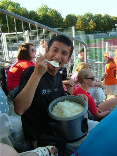 大会二日目から、日本代表の試合がスタート。男女とも1勝1敗で初日を終え、三日目以降の試合に備えます。このあたりから、お米が全く出ず、ポテトやパンばかりの食事にまいってくる選手が出始め、持ってきたお米を炊くための炊飯器を購入しました。